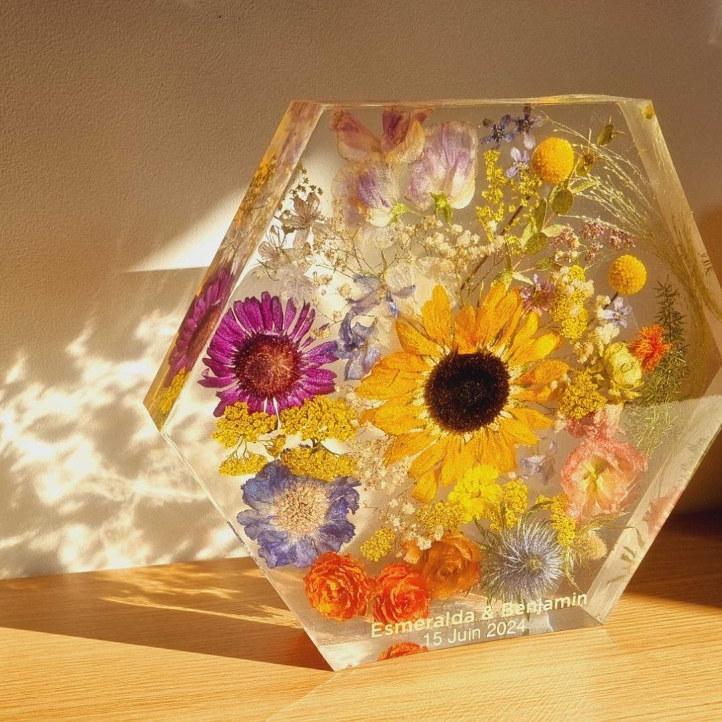 Grâce à des techniques artisanales et contemporaines, les fleurs deviennent des trésors intemporels : bijoux uniques, cadres fleuris ou créations en résine sur-mesure.